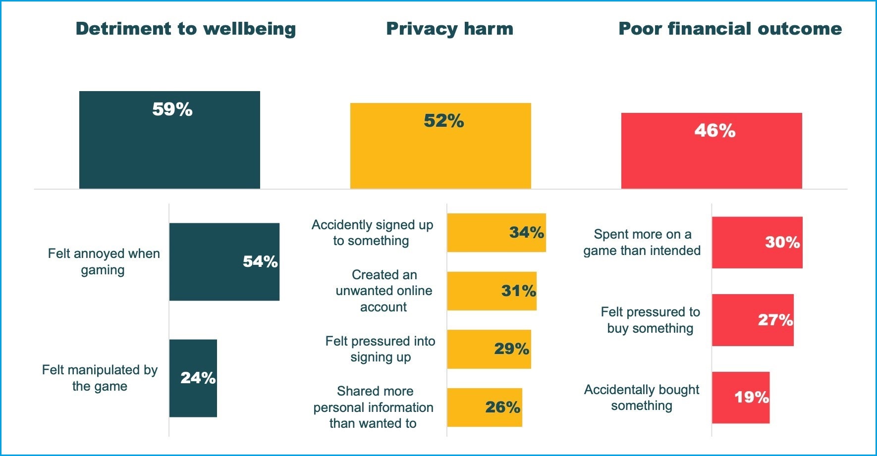 Dark patterns were commonly observed by respondents, 58 per cent of whom said they had encountered over 10 different types of dark game patterns in the past 12 months.