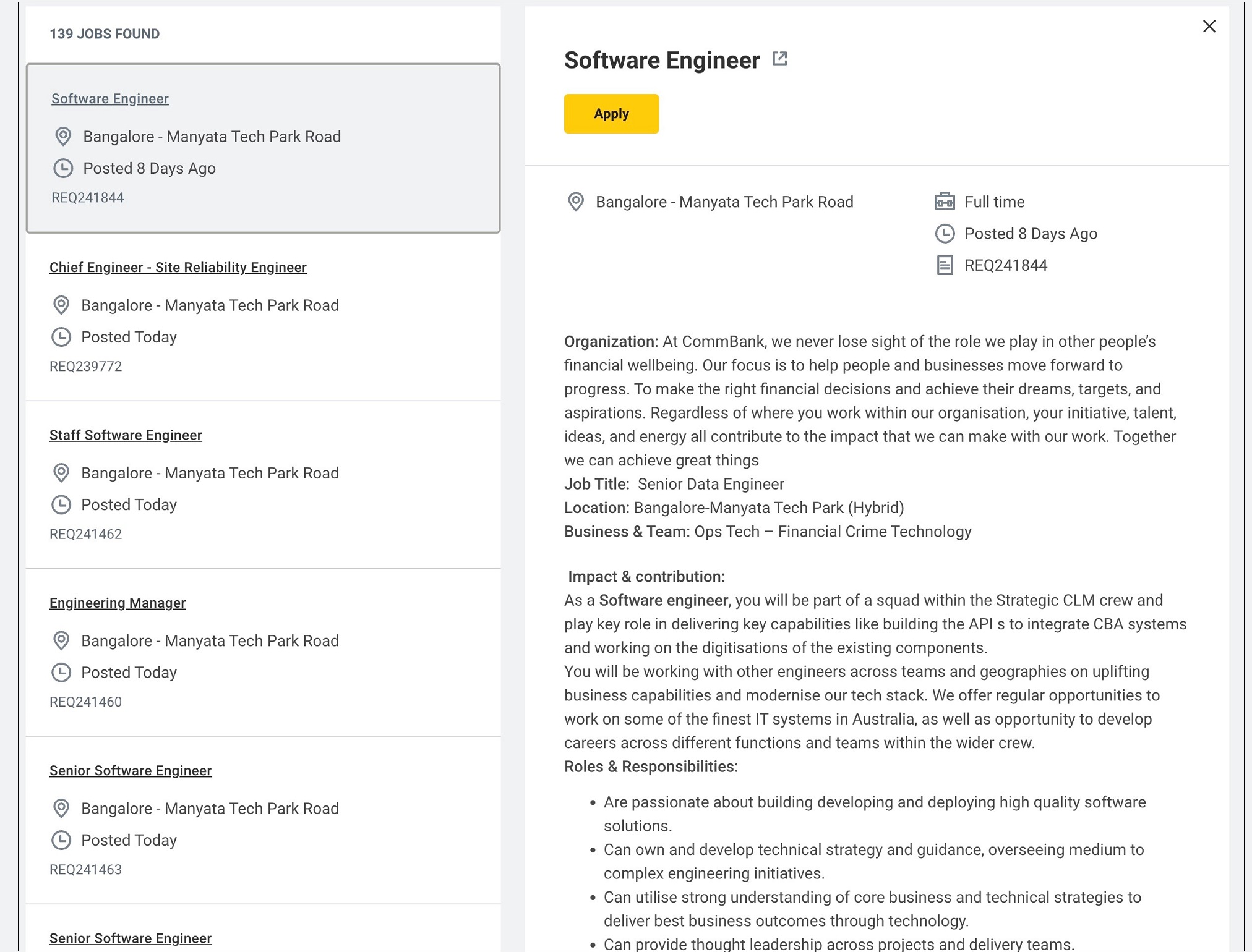 One Software Engineer role at the Bangalore-Manyata Tech Park promises a “key role in delivering key capabilities like building the APIs to integrate CBA systems…. [and] regular opportunities to work on some of the finest IT systems in Australia.”