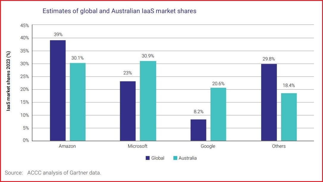 While other providers in Australia made up around 20 per cent of the market in 2023 according to ACCC analysis of data from advisory firm Gartner, outside of Australia they held around 30 per cent of the global market.