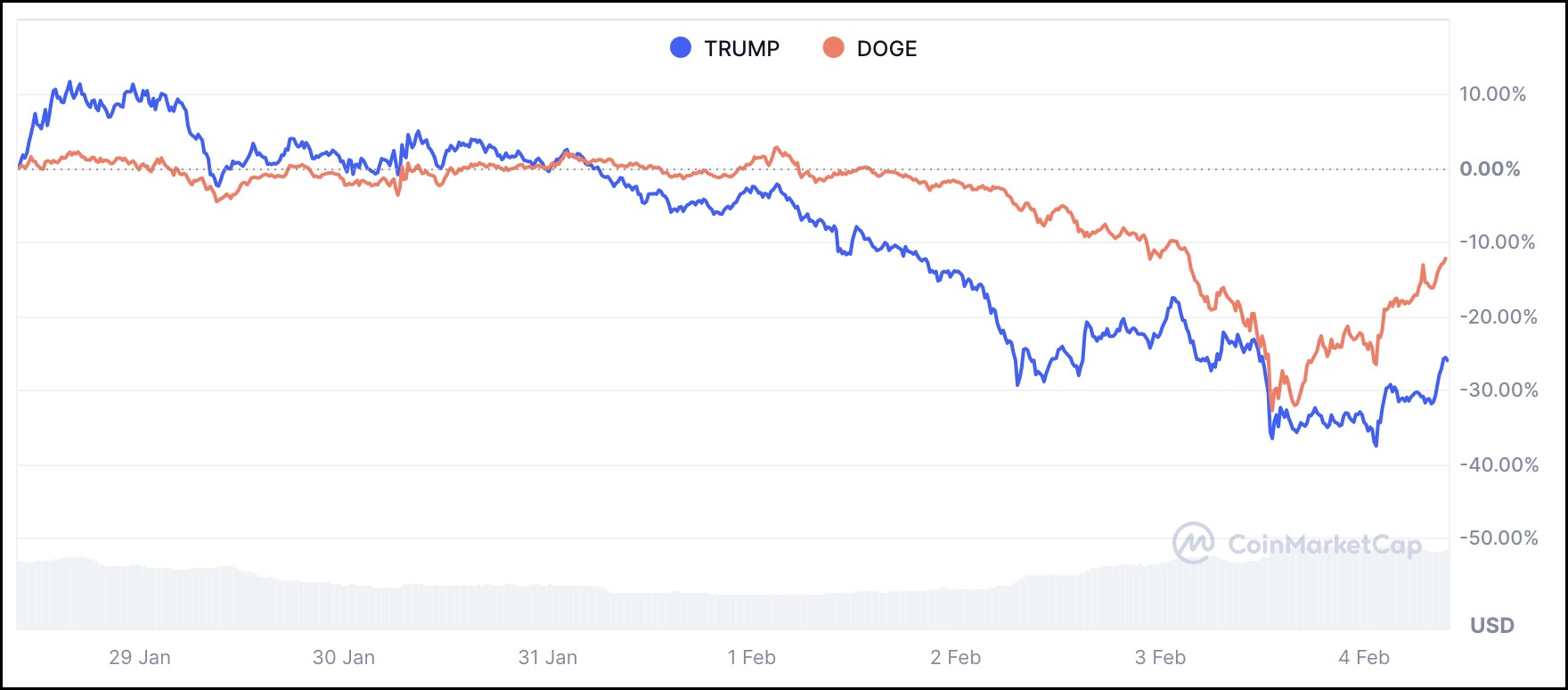 Trump and Doge coins compared, price in $USD thousands. Chart: CoinMarketCap