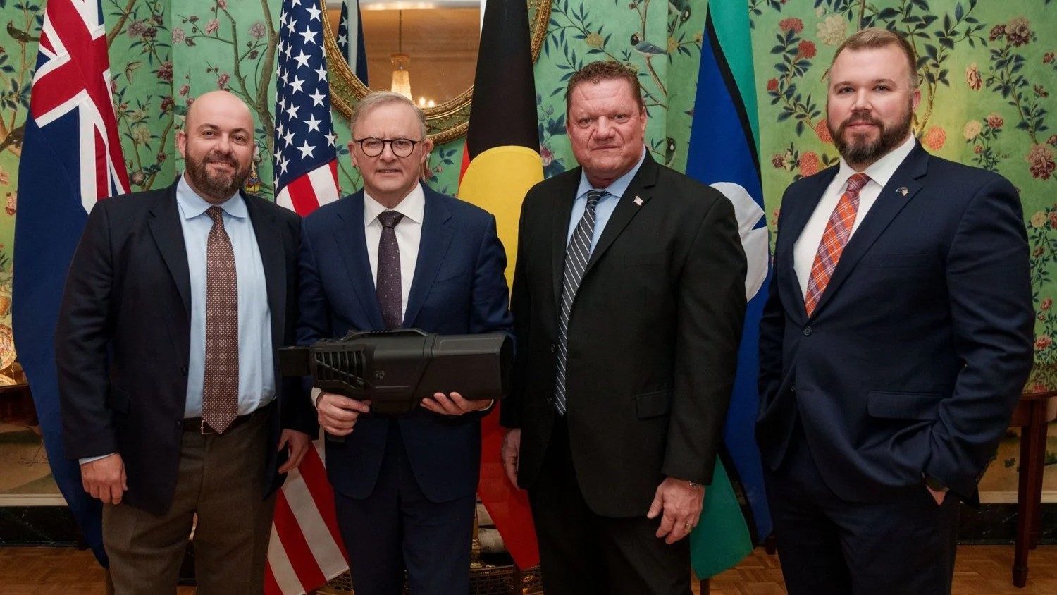 Prime Minister Anthony Albanese (second from left) holds a DroneShield device alongside then-US CEO Matt McCrann (far right) at the White House complex in 2023. Image: DroneShield / Supplied
