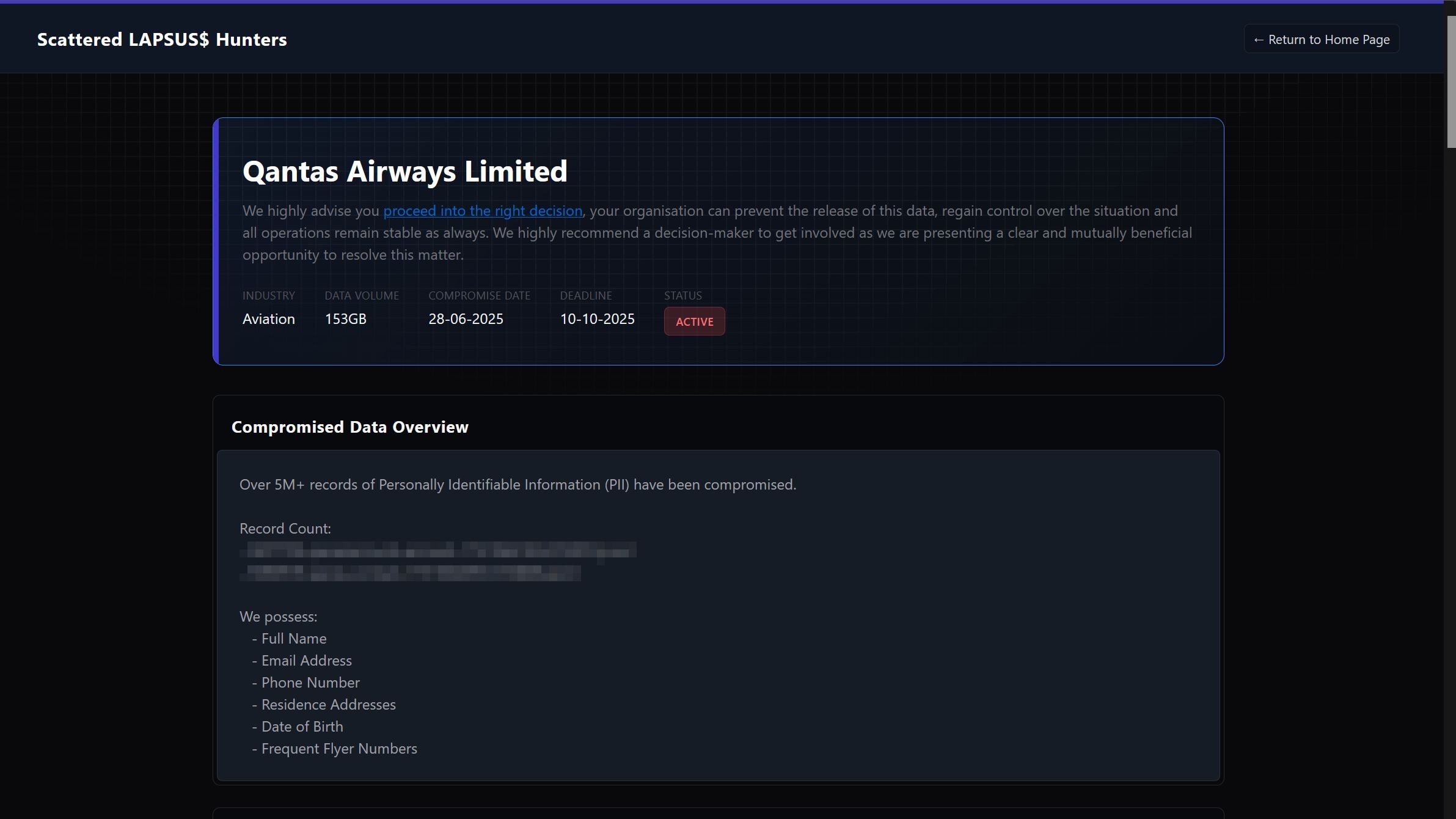 For Qantas, the website described 153GB of data allegedly stolen 28 June.