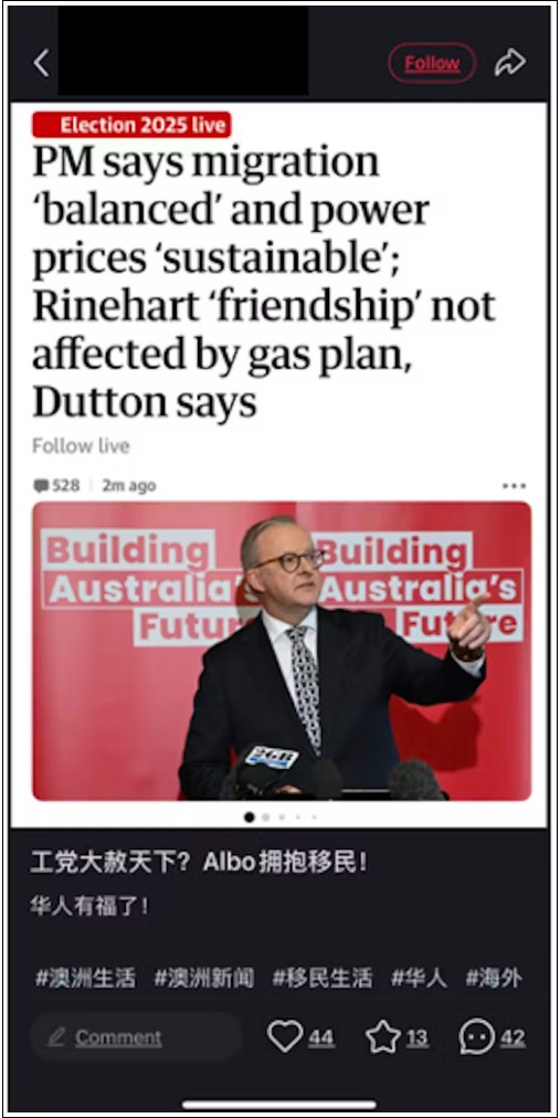 The screenshot of the post, with the media account covered for privacy. The hashtags translate as #AustralianLife #AustralianNews #ImmigrantLife #ChineseAustralian #Overseas.