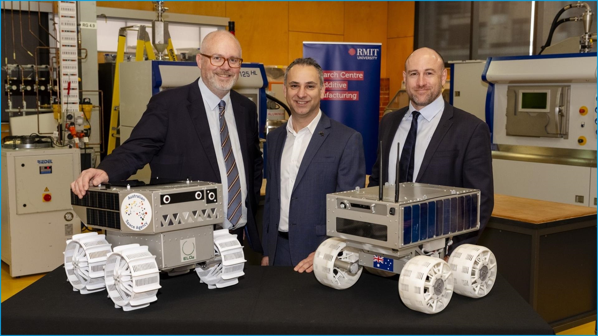 [L-R] Minister for Industry, Innovation, and Science, Tim Ayres; Head of the Australian Space Agency, Enrico Palermo; and Ben Sorensen, director of the consortium developing Roo-ver. Image: Australian Space Agency / Supplied