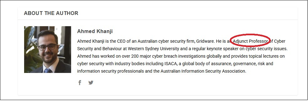 Until recently, the Gridware website said that its CEO, Khanji, was an “Adjunct Professor at Western Sydney University”, while a separate article authored by Khanji several years ago said he was an “Adjunct Professor of Cyber Security and Behaviour at Western Sydney University”.