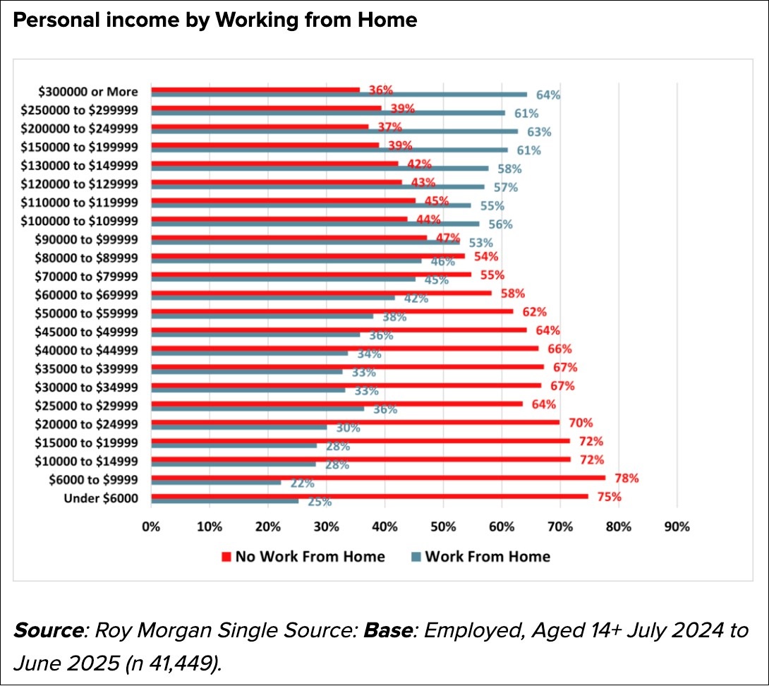 While 51 per cent of all full-time employees work from home at least some of the time, just a third of those earning $30,000 to $49,999 do so, research firm Roy Morgan found after interviewing 41,449 employed Australians from July 2024 to June 2025.