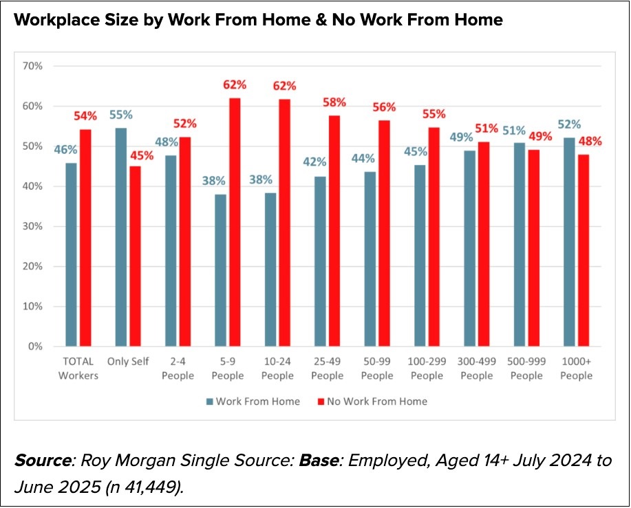 The findings show that WFH arrangements “have become a permanent and distinct feature of Australia’s employment sector,” Roy Morgan CEO Michele Levine said, flagging the data’s confirmation of “significant variation by workplace size, sector, and income level.”