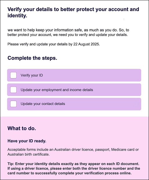 “Verify your details,” reads the subject line of the email as it exhorts you to upload your driver licence, passport, Medicare card, or birth certificate “to better protect your account [and] enter your identity details exactly as they appear on each ID document.”
