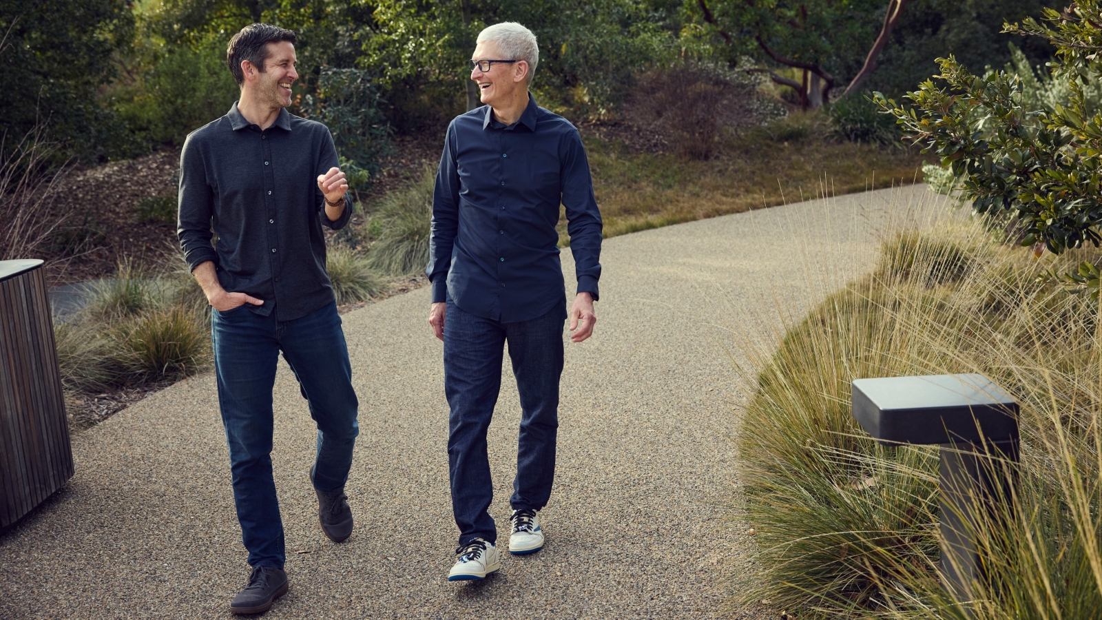 Apple's next CEO, John Ternus (left), with outgoing CEO Tim Cook (right) at the company's headquarters. Image: Apple / Supplied