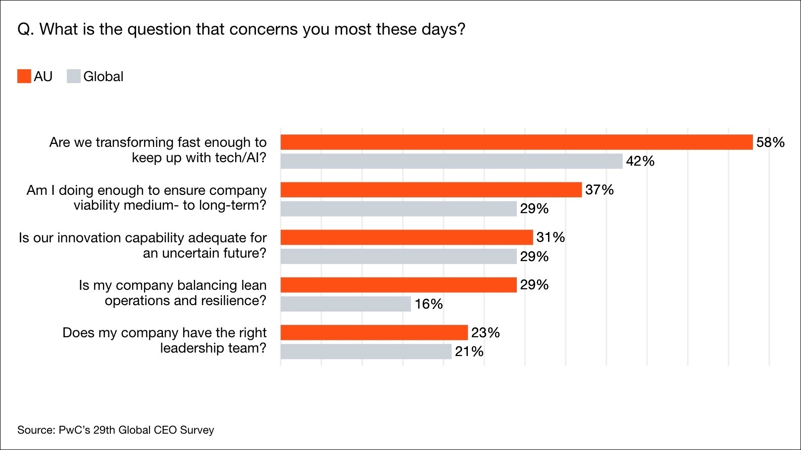 PwC found Australian CEOs are more concerned than global peers about their transformation speed, company viability, and resilience. Image: PwC