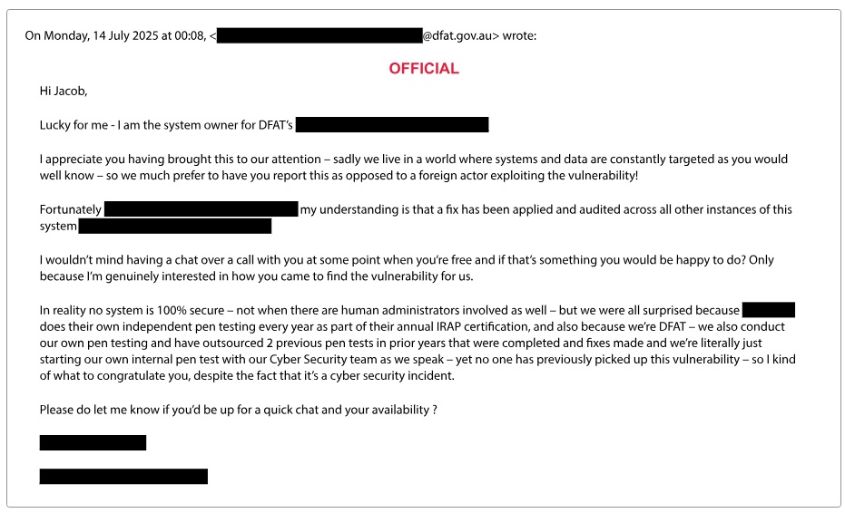 Less than two hours later, Riggs had identified what he said was an “exploitable critical severity vulnerability”, which he reported to DFAT.