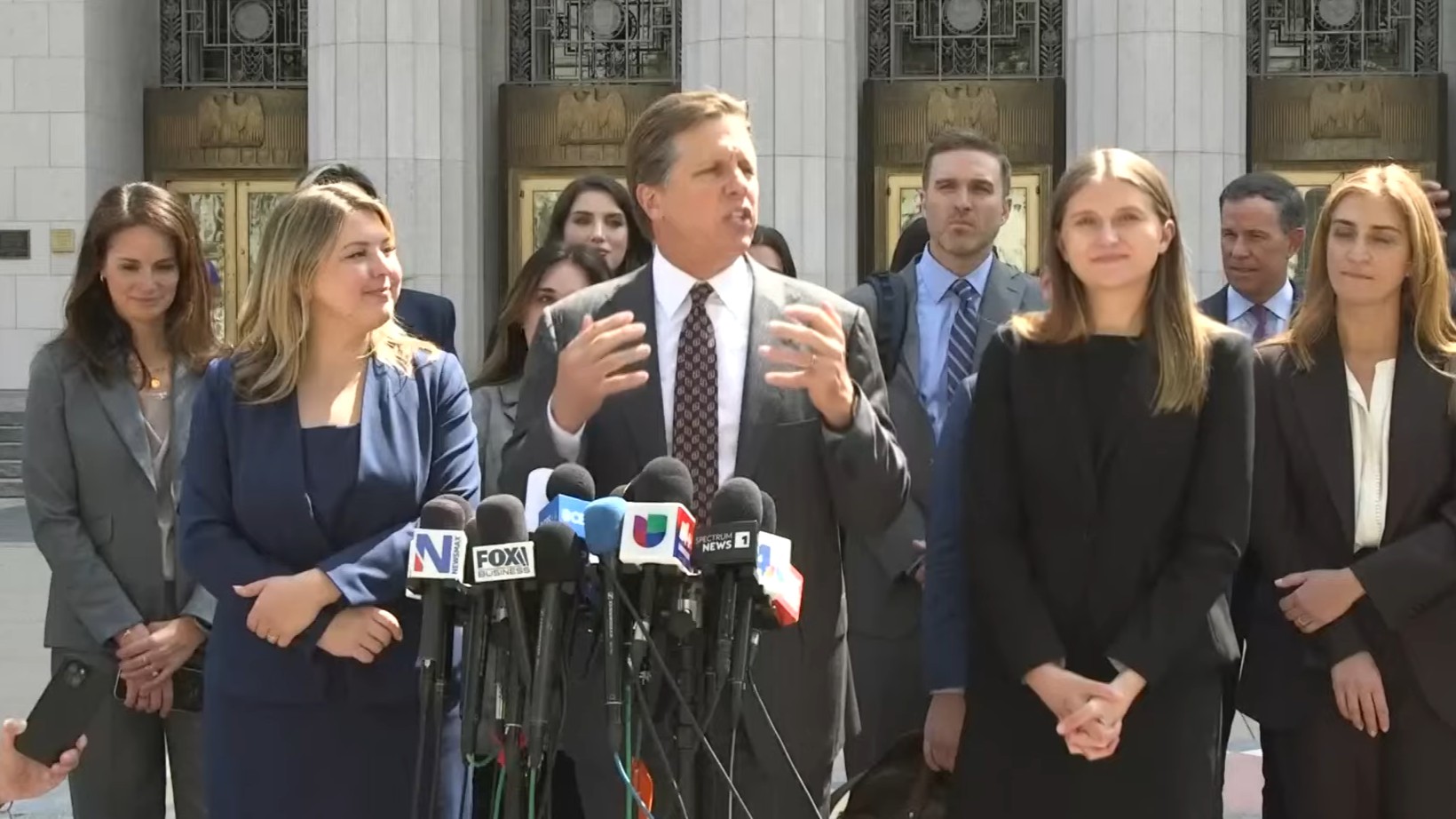 Kaley's lead lawyer Mark Lanier (centre) speaks outside the Los Angeles court. Image: Reuters / YouTube