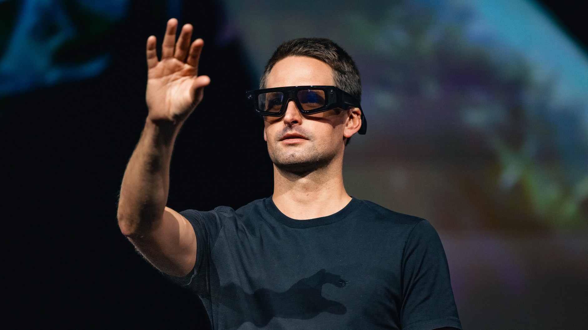 Snap CEO Evan Spiegel, seen here using the company's AR Spectacles, says AI is helping reduce team sizes and repetitive work. Image: Snap