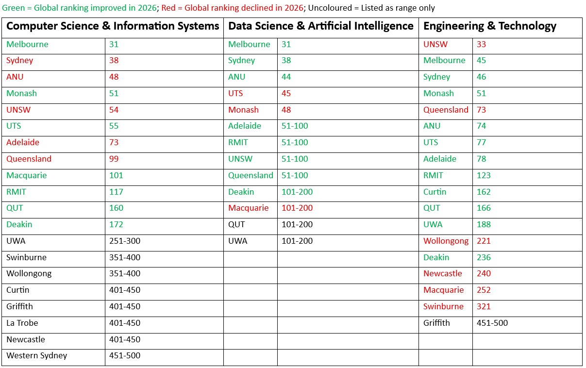 Despite concerns about middling performance on a recent AI skills benchmark, data science and AI teaching is also improving – with Melbourne, Sydney, and ANU surging as Adelaide, RMIT, and Queensland debuted in the top 100 – and Deakin, QUT, and UWA in the top 200.