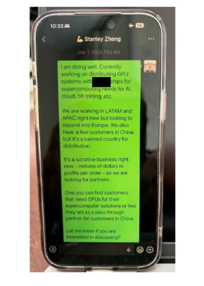 DOJ highlighted an exchange where, in a group chat titled “GPU Partnership”, Zheng sent a message discussing the market value of Nvidia’s chips in China.